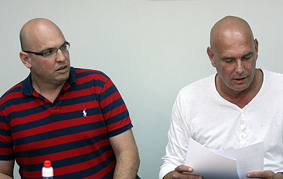 מוני הראל והיו"ר לובין במסיבת העיתונאים (צילום: דרור עינב)