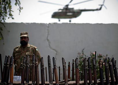 צבא פקיסטן מציג כלי נשק שנתפסו באזור השבטי בגבול אפגניסטן (רויטרס)