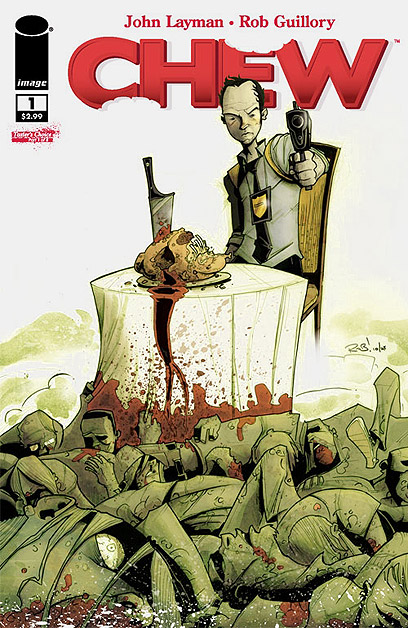 כמו שסדרות המשטרה בטלוויזיה השתנו בשנים האחרונות לסדרות גימיק כמו "המנטאלסיט" ו"שקר לי", גם בקומיקס השוטרים מקבלים גימיקים. צ'ו (Chew) גם הוא של הוצאת Image, מתרחשת בעולם שבו לאחר ששפעתה עופות הורגת 23 מיליון אמריקאים, והעוף הופך לבלתי חוקי. טוני צ'ו, שוטר בפילדלפיה מגוייס ל-FDA (הרשות לאוכל וסמים) שהיא עכשיו מחלקת הלחימה בפשע החזקה ביותר בארה"ב.