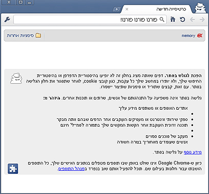 כדי להמשיך ולגלוש מבלי שתרשם היסטוריית הגלישה שלך, לחץ על Ctrl+Shift+N. החלון שייפתח יאפשר לך לגלוש במצב אינקוגניטו, בו היסטוריית הגלישה שלך לא נשמרת כלל.