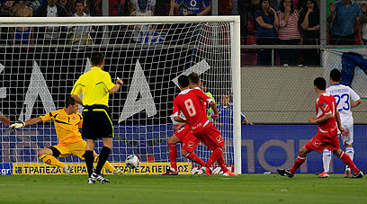 פטספצידיס בדרך לשער הראשון שלו מול מלטה (צילום: AP)