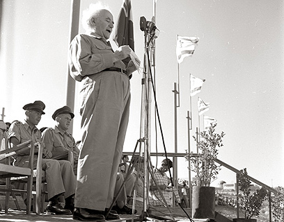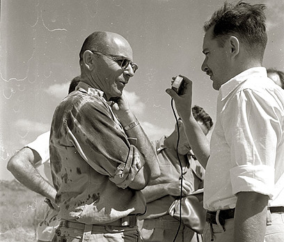 "תדע כל אם עבריה שמסרה את גורל בניה לידי המפקדים הראויים לכך". על הספסל מאחור: יצחק רבין וישראל טל.