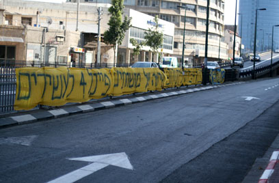 שלט שתלו אוהדי מכבי ת"א בדרך מנחם בגין בת"א (צילום: יועד כהן)