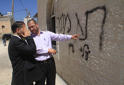ביום שבו מציינים הפלסטינים את כיבוש ירושלים, המציתים כתבו על הקיר בין היתר "עלי עין" - שמו של המאחז הסמוך שפונה בשבוע שעבר. תושבי הכפר: "הושלכו צמיגים בוערים, חלק גדול מהמסגד נשרף". צה"ל מנסה להרגיע
