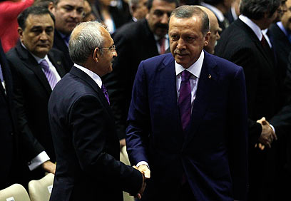שני היריבים לוחצים יד בפרלמנט באנקרה (צילום:EPA)