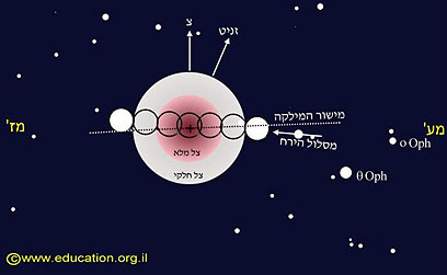 שלבים בליקוי הירח שיערך מחר: מיקום הכוכבים ביחס לירח מאויר ביחס לצופה בישראל בשיא הליקוי. העיגול הבהיר, החיצוני, מציין את הצל החלקי. כאשר הירח מצוי בצל החלקי אין כמעט ירידה באורו כי חלק מקרני השמש עדיין מגיעות אליו. כאשר כל הירח מצוי באזור הצל המלא, זהו הליקוי המלא וגונו אדמדם. הכוכבים הם כוכבים בקבוצת נושא הנחש. יש לשים לב שהאיור מאויר כך שכשהצפון כלפי מעלה (מזרח משמאל), אז הנקודה הגבוהה ביותר של הירח מעל האופק היא זו המצביעה לכיוון הזניט.