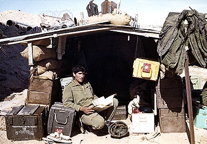 9. המוצב במזח היה כה צפוף שיכלו לשכון בו רק לוחמי החי"ר. לטנקיסטים הייתה "הגנה טבעית" – הטנק. קשה להיות 24 שעות בטנק, ועל כן בנו סוכות. צופה תורן היה שורק במשרוקית ברגע ששמע יציאת פגז מהעבר השני. אז היה נחוץ להיכנס לטנק כהרף עין. הטנקיסטים היו כה דרוכים שגם סגירת דלת של ארגז קרח הייתה מקפיצה אותם. בתצלום מ"מ 3, יגאל שמוחה, בסוכה מאולתרת. יגאל נהרג באותו קוו מפגיעה ישירה של פגז מרגמה בצריח הטנק שבו היה.