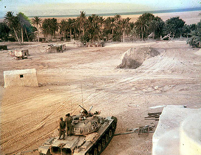5. טנק ממחלקה 2 על דרך הכניסה למזח. ברקע משאית צה"ל שנשרפה בהפגזה, ליד מגדל התצפית, ומעבר נראית חלקת המים עד לעיר סואץ.