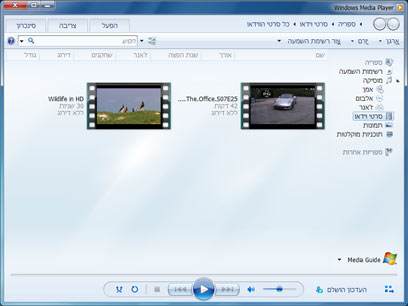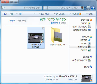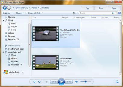 שימו את הקבצים שאתם רוצים לנגן בתוך ספריית "סרטי וידאו". ניתן לגשת לספריה מתוך כל חלון תיקיה בסרגל הצדדי תחת "ספריות".