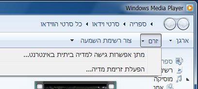 בסרגל הכלים העליון של Windows Media Player לחצו על "זרם" ושם בחרו באפשרות "הפעלת זרימת מדיה".