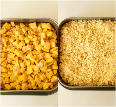 - מפזרים את קוביות הפרי באופן אחיד על גבי הבסיס. מפזרים מעל את יתרת פירורי הבצק.