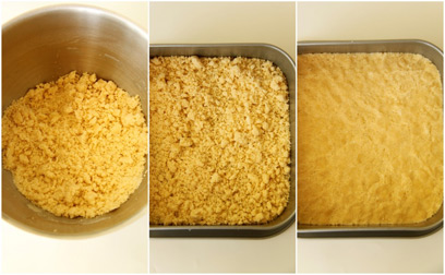 מתחילים בהכנת הבצק. הבצק ישמש גם כבסיס לעוגה וגם כציפוי פירורים פריך. זהו בצק חמאה פשוט, אך הפעם, אין צורך להגיע לעבד אותו עד לשלב שבו הוא מתגבש לבצק, אלא יש להשאיר אותו במצב של פירורים גסים. מעבירים חלק מהפירורים לתבנית, בעזרת הידיים מהדקים לשכבה דקה. מעבירים את התבנית ואת יתר פירורי הבצק לקירור ובינתיים מכינים את מלית הפירות.