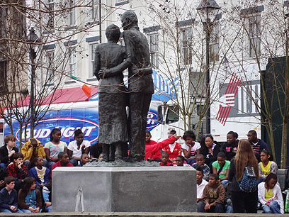 מסבירים לילדים על העבדות מול פסל משפחת עבדים, בנמל סוואנה הדרומית