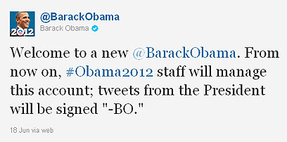 אובמה העביר את הפיקוד על נוכחותו ברשתות החבריות מצוות עובדי הבית הלבן ליועצי התקשורת שלו ביום שישי האחרון, זאת לאור התקרבות הבחירות לנשיאות ב-2012. כך נכתב בהודעה רשמית בטוויטר של נשיא ארה"ב.