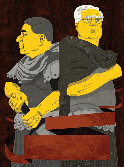הראשון מנהל את העניינים מהיציע בלי לאיים, בלי שאף אחד יגיד לו מה לעשות, אבל גם בלי לשכוח את מי בא הקהל שלו לראות. השני יורד מהפסים על הספסל, נושף בעורפם של מאמנים ומאמין בסמילם רק כשהם מודפסים על גופיות. ניב שטנדל בודק מה מבדיל - ולא פחות מעניין, מה מחבר - בין יעקב שחר לשמעון מזרחי, שני הקיסרים של הספורט הישראלי