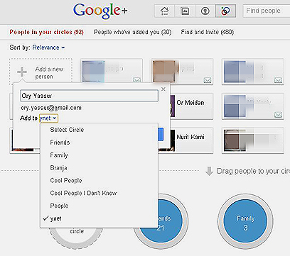 לשם הדוגמה, נניח שידיד המערכת אורי יסעור הוא מישהו שאנחנו רוצים לראות בפיד הגוגל פלוס שלנו. נוסיף אותו לרשימת החברים (מעגלים > הוסף אדם חדש):
