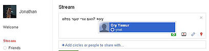 עכשיו כשאורי ב"מעגלים" שלנו, נוכל לתייג אותו בפוסט. אפשר לכתוב חמשיר זימה העוסק בחבר שלכם, לפרסם תמונה של ארון מטאטאים ולתייג את אחד מהם בתור החבר שלכם, וכן הלאה. כדי לתייג, מקישים + (כמה ברור) ובלי רווח, מתחילים להקליד את שם החבר: