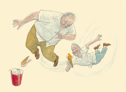 הסבא השמן לא רק אוהב את החיים ומוכן "לטרוף" אותם במלואם, אם להיצמד למטפורה המתאימה יותר לרוח הסיפור, אלא שהוא גם חסר זהירות וחסר אחריות לעומת הסבא הרזה. זה האחרון מתואר כמי שמקפיד להוציא את החרצנים לפני שהוא נותן זיתים לנכדתו (לצד מלפפון ועגבנייה, כי אצל הסבא הרזה אוכלים "רק דברים בריאים"), אבל אצל הסבא השמן? הילולה וצהלה! במקום לצעוד בים כמו עם הסבא הרזה, הולכים לבלות בלונה פארק, ושם הנכדה החביבה מורשית לעלות למתקנים אף על פי שחסרים לה כמה חודשים כדי להגיע לגיל המתאים.