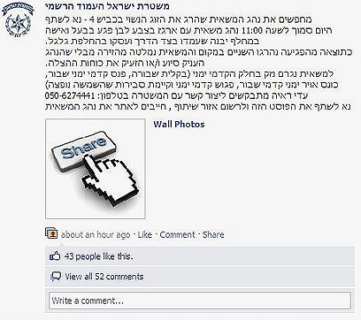 אין זו הפעם הראשונה שהמשטרה מנסה לפענח מעשי פשע בעזרת הרשת החברתית. בסוף השבוע היא ביקשה שם את עזרת הציבור בחיפושיה אחרי שני אחים שנעדרו מביתם באיזור המרכז. 105 איש לחצו "לייק" על אותה הודעה עם תמונות השניים, ו-200 איש שיתפו אותה.