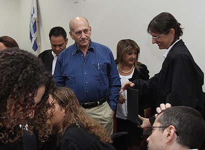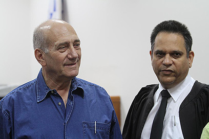 "צריך להכין שיעורים". אולמרט ועו"ד מיכה פטמן, היום (צילום: גיל יוחנן)