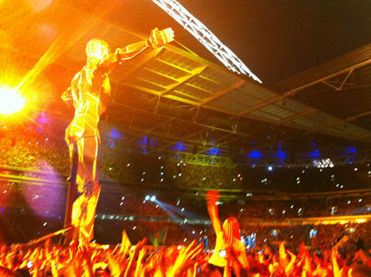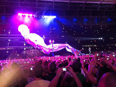 אבל נתחיל בהתחלה. איצטדיון וומבלי בלונדון, עשרות אלפי אנשים נהנים מהופעת חימום של ה"פט שופ בויז", שלעצמם נראו נרגשים להופיע בפני כמות קהל עצומה ומפרגנת שכזאת. כמו בהופעה שנתנו בארץ לפני כשנה, הצמד, לבוש בשחורים ומלווה באביזרים צבעוניים כגון מטריות וכובעים, סיפק את מיטב להיטיו.