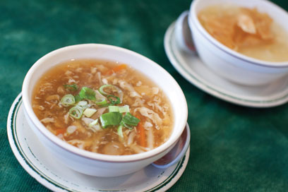 מחליטים לפצל את ההזמנה לשניים: עסקית אחת (49 שקל), וכל השאר פתוח. העסקית מציעה מרק, אגרול, עיקרית, אורז וכוס משקה קל. מרק התירס העסקי (16 שקל בתפריט הרגיל) מבהיר לנו שאנחנו במקום הנכון: נוזל סמיך ותפל שנטיפי חלבון ביצה ודוגמיות עוף צפים וטובעים בו. וואו, איזה כיף לפגוש שוב את יציקת הקורנפלור המזוויעה הזאת.