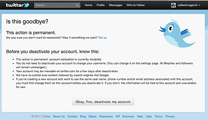 ההתנתקות מטוויטר פשוטה יחסית. הכנסו לחשבון שלכם ובחרו ב-Settings. כעת גללו עד לחלקו התחתון של החלון. קישור שקל לפספס מודיע שלחיצה עליו תעביר אתכם לעמוד בו תוכלו לבטל את הרישום שלכם לטוויטר. לחצו עליו, ולמרות גל הבהלה שתוקף אתכם אל תכנעו ולחצו על הכפתור הגדול שאומר Ok, fine, deactivate my account. עשו זאת ותהיו משוחררים מעולם מאות הציוצים של כל האנשים אחריהם החלטתם לעקוב, אנשים שגזלו שעות על גבי שעות מחייכם בקישורים מגוחכים ותגיות מרגיזות. מחיקת החשבון אינה מיידית. שלא כמו פייסבוק, לא תוכלו לחזור ולהפעיל את החשבון אחרי המחיקה. מצד שני, הטוויטים שלכם ימשיכו לחיות כחודש ויותר אחרי סגירת החשבון.