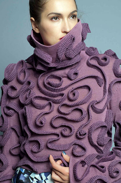אבל היו כמה קולקציות שהצליחו להפתיע אפילו ציניקן-פאשניסט שכמותי: נתחיל בסריג הסגול שהציגה ניצן קריספיל תחת הכותרת של "הצטלבות הרמונית". קריספיל יצרה שפה ויזואלית שמפגישה בין שני סגנונות אמנות מנוגדים (הארט-נובו והארט-דקו) והתוצאה היא עושר טקסטילי מול בדים נשפכים, וזרימה מול פיתול גיאומטרי. התעלפתי על הסריג ועל המכנסונים בשחור-לבן שהשלימו את המראה. ואני לא לבד; גם קארן דונסקי ציינה את הקולקציה של קריספיל כאחת משלוש ההיסטריות של הערב.