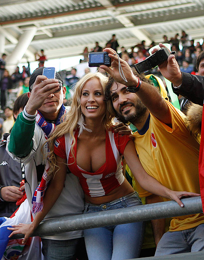 פאטי אורואה, דוגמנית ואוהדת פרגוואי חוגגת ביציע (AP)