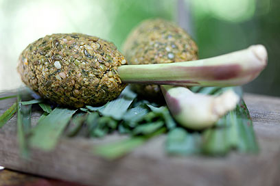 - בעזרת ידיים רטובות יוצרים קציצות מאורכות ומעצבים אותן סביב מקל עשב לימון.
