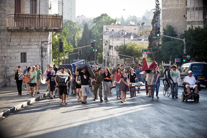 אנשי מחאת האוהלים בירושלים הציבו רהיטים שהביאו מבתיהם במרכז הכביש. בין היתר הם הניחו שם ספות ומזרונים. התנועה המשיכה להתנהל בנתיב אחד, בסמוך לכיכר ספרא. המפגינים צעקו: "אין דיור - אין פרנסה", "מהפכה", "אין לי כסף - תתעורר הממשלה" ו-"ביבי, ביבי, תתעורר - ההמון שווה יותר".