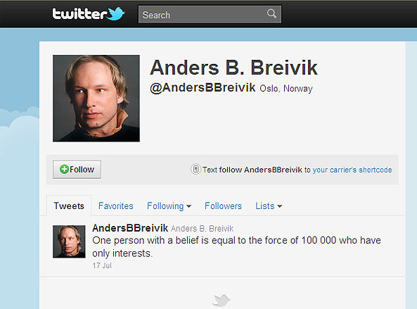 חובב "דקסטר" ו"דם אמיתי" חולל את מתקפת הטרור הקטלנית ביותר של רוצח בודד בתקופה המודרנית. אנדרס ברינג ברייויק, החשוד המרכזי בביצוע מעשי הרצח בנורבגיה, לא היה מוכר למשטרה עד אתמול. למעשה, גם פעילותו החברתית ברשת האינטרנט היתה מוגבלת, וחשבונותיו בפייסבוק ובטוויטר - שניהם נפתחו רק לאחרונה - מעלים אפשרות כי ברינג ברייויק הקימם רק למטרה זו: מעין תיעוד של השקפותיו, שיקבלו נופך פומבי לאחר הטבח.