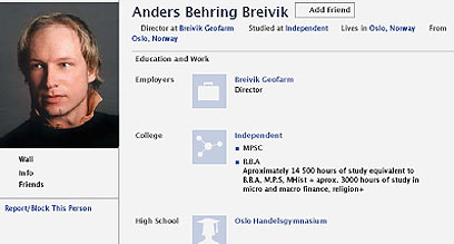 חשבון הפייסבוק שלו, שנפתח רק ב-17 ביולי, לא כולל קשרים חברתיים כלשהם של ברייוויק ומספר חבריו, כפי שהוא מוצג כעת, עדיין עומד על אפס. תחומי ההתעניינות של החשוד: ציד, פוליטיקה ומנעד מוזיקלי הנע בין מוזיקה קלאסית ליצירות טראנס.