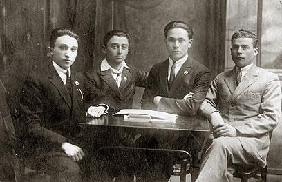 4. מייסדי תנועת השומר הצעיר בבריסק. בראש השולחן מאיר פרידמן - ראש הקן, שלישי משמאל עקיבא קרביצקי - גזבר ומארגן הפעולות.