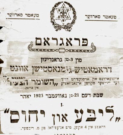 10. פלקט בבריסק: "ליבע און יחוס" דראמה ב-4 מערכות, שחקנים: יידישער סקויטן ארגאניזאציע "השומר הצעיר" אין בריסק. שבת 21 נאוועמבר 1925 יאהר. עקיבא היה מארגן פעילות תרבות בבריסק וההכנסות קודש לפעילות הציונית של תנועת הנוער.
