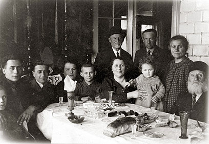 15. בשנת 1928 נישא עקיבא לשושנה לבית בורנשטיין, אותה הכיר בארץ. התצלום: בעת ביקור של הזוג הצעיר, לאחר החתונה, בבית הוריו של עקיבא בבריסק. מימין: הוריו של עקיבא עם אחיו ואחיותיו, יושבים סביב שולחן ערוך.