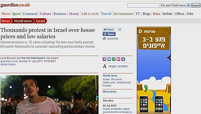 "ההפגנות הגדולות ביותר שראתה ישראל בעשורים האחרונים", כינה ה"גרדיאן" הבריטי את הפגנות המחאה שנערכו בשבת האחרונה ברחבי המדינה, תוך שהוא מתייג אותן כ"נקודת השיא של תנועת המחאה העממית שצברה בשבועיים האחרונים מומנטום ולא מראה כי היא הולכת לוותר על דרישתה ל'צדק חברתי'".