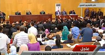 Egypt's state television showed images of Hosni Mubarak's ambulance drawing up to the court building. Crowds of security and other people surrounded the vehicle immediately. The former President was carried into the courtroom on a gurney, accompanied by a medical team.
