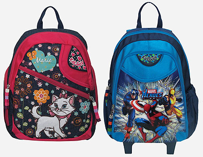 תיקי גן של דיסני, כוללים דמויות כמו מיקי מאוס, פו הדוב, מכוניות, מיני, נסיעות ועוד. מחיר: 99 שקל. ניתן להשיג באופיס דיפו ,קרביץ, הפנינג כפר השעשועים וחנויות מובחרות.