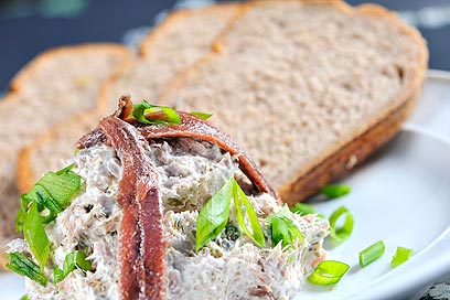 - קוצצים צלפים ובצל ירוק ומוסיפים לטונה, מוסיפים מיונז ומתבלים בפלפל שחור. מגישים עם אנשובי מעל לסלט.