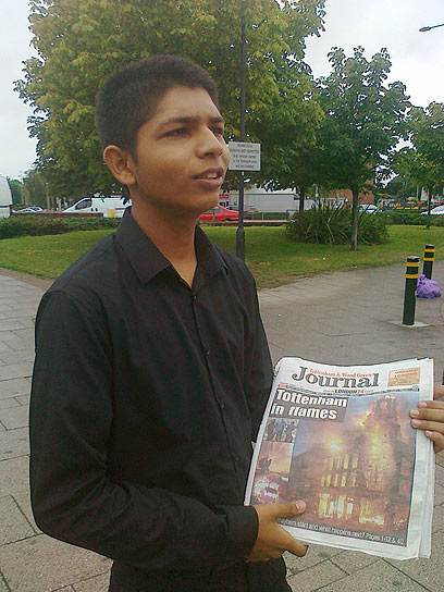 "טוטנהאם בלהבות" זעקה הכותרת מבעד לחינמון שמחלק בצהרי חמישי מוכר העיתונים בתחנת הרכבת, מטרים ספורים מהגשר שבו נורה תושב השכונה מארק דוגאן, במה שהצית את גל המהומות ששטף בימים האחרונים את בריטניה. ובשער העיתון תמונת מבנה שהוצת כליל במרכז השכונה. תחת גשם שוטף, חמישה ימים אחרי, הכותרת של העיתון כבר לא רלוונטית.