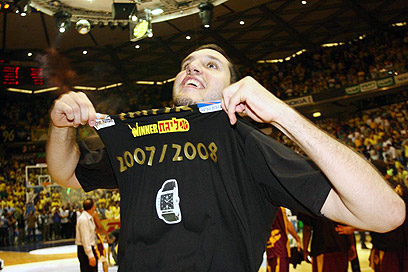 עמית תמיר חוגג את האליפות עם חולון ב-2008 (צילום: אלי אלגרט)