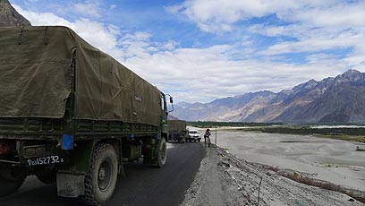 מדינת צבא: רוכב אופניים בצפונה של הודו מפתח מהר מאד פריחה צורבת בעור למראה משאית בצבע ירוק הנראית למרחוק. זוהי התנייה בלתי נמנעת. כי אין כבר ספק שאחרי המשאית הזו נשרכת עוד אחת ועוד אחת ועוד 200. מה זה אומר? שעליך להבין שתרצה או לא, עליך להסתלק מהדרך ולהמתין בענן אבק בחצי שעה הבאה. אפילו נהגי המשאיות ההודים מפנים דרך לצבא העליון שנוכחותו המסיבית כאן בגזרת האויבות סין ופקיסטן הופכת מידית כל רוכב אופניים - האחרון בשרשרת המזון - לפציפיסט מושבע.
