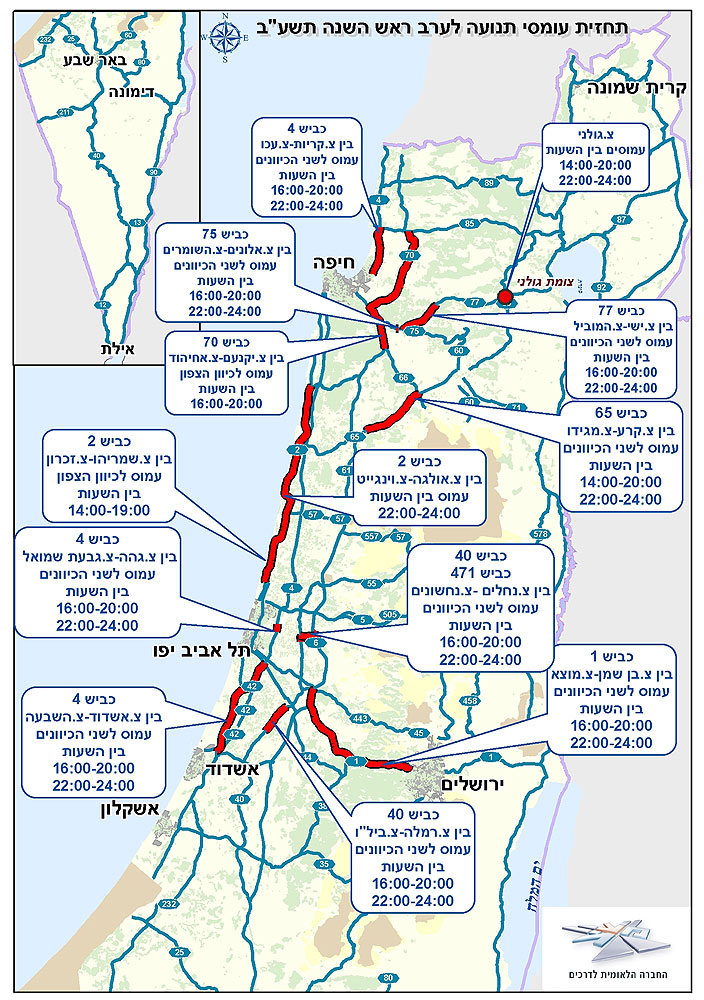 החברה הלאומית לדרכים (מע"צ) מפרסמת את מפת פקקי התנועה הצפויים לערב ראש השנה החדשה וימי החופש שאחריו. מומלץ להתעדכן, למנוע מעצמכם בזבוז מיותר של זמן, וזיהום מיותר של האוויר