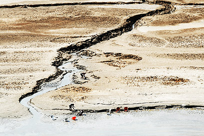כך קורה, שים המלח ה"אמיתי," הצפוני, הולך ומתייבש ונסוג כל הזמן – כיום בקצב של 1.25 מטר בשנה, "קצב ירידה מטורף שמביא לקריסת המערכות הטבעיות," מבהיר אלי רז – בזמן שבאגן הדרומי המפלס מאיים לעלות על גדותיו ולהציף הכל. אין שום דבר טבעי או מאוזן במצב הזה.