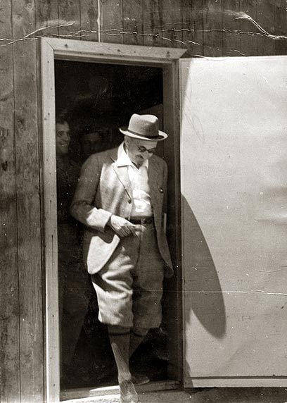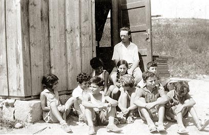 7. ארגז עץ שקרעו בו דלת וחלונות שימש לכתה. בתצלום המורה והמחנך פולי עם קבוצת הילדים בפתח הכיתה.