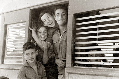 20. מדי פרק זמן מסוים, היו הילדים חוזרים לבקר את הוריהם בקיבוצים. חלונות האוטובוס מוגנו כנגד יידוי אבנים בדרכים. בפתח האוטובוס עומדים מימין מיכאל קוסטא, אפרים ריינר, יעל מקיבוץ גן שמואל.