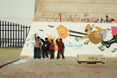 ילדים על רקע ציור קיר מול המפרץ של בנגאזי 3.2011