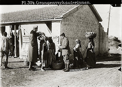18. בנות ערביות מביאות תפוזים לאנשי הטייסת בחצר מרחביה