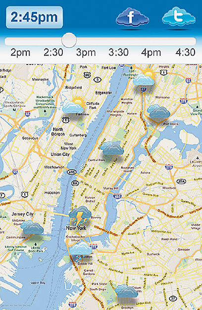 מסך המפה כולל חמישה אייקונים המשמשים כסמנים. ניתן למקם אותם על נקודות שונות וכך לראות במקביל מהו מזג האוויר בכולן גם יחד. מסך אחר מחובר לשירות המפות של גוגל ומאפשר איתור של מיקום ספציפי, שלגביו המשתמש מעוניין לקבל נתונים. אפשר ליצור גם רשימה אישית של מיקומים "מועדפים." רייך מסביר":רובנו מתעניינים במזג האוויר בכמה מקומות הקרובים לליבנו או שהלו"ז שלנו מאורגן לפיהם. למשל, הגן של הילדה, בית ההורים, מקום העבודה והבית שלנו. גם אם כל נקודות הציון האלה נמצאות באותה שכונה, הם בדרך-כלל יתאפיינו במזג אוויר מעט שונה באותה נקודת זמן. אז למה שלא נוכל לקבל תמונה פרטנית על כל אחד מהם."?